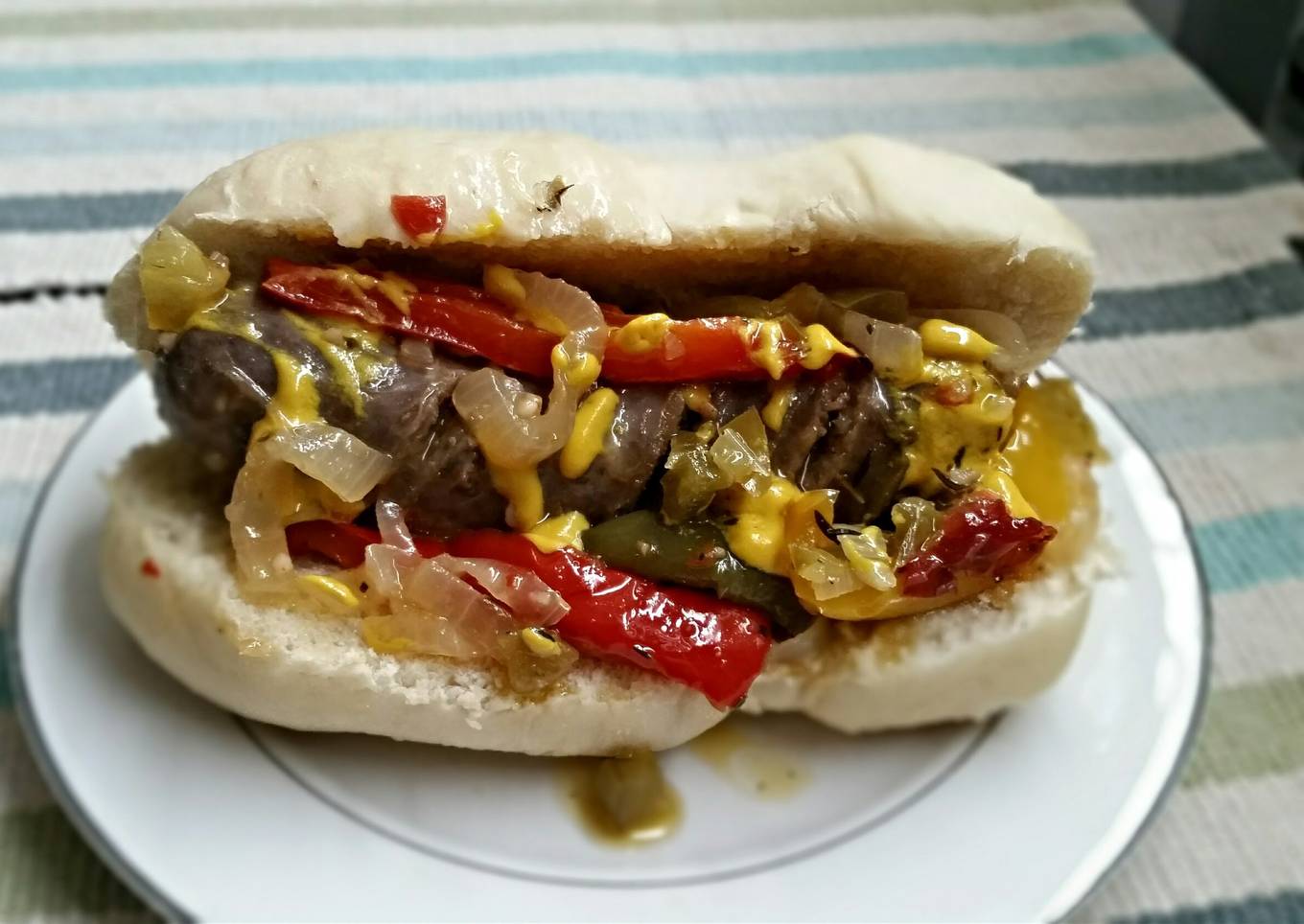 - Building your "Sassidge Sangwitch": Place a sausage on a bun, slather in good yellow mustard, top with an ample amount of caramelized onions, peppers, and Giardiniera
