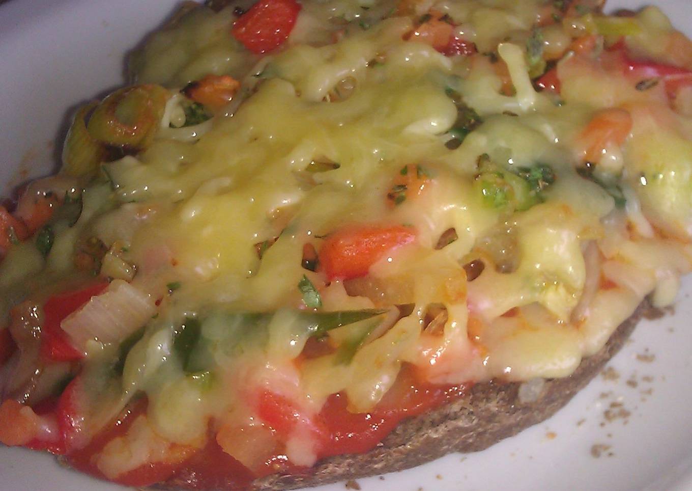 - Put the tomato frito on top of the slice of bread and the vegetables and herbs and cheese