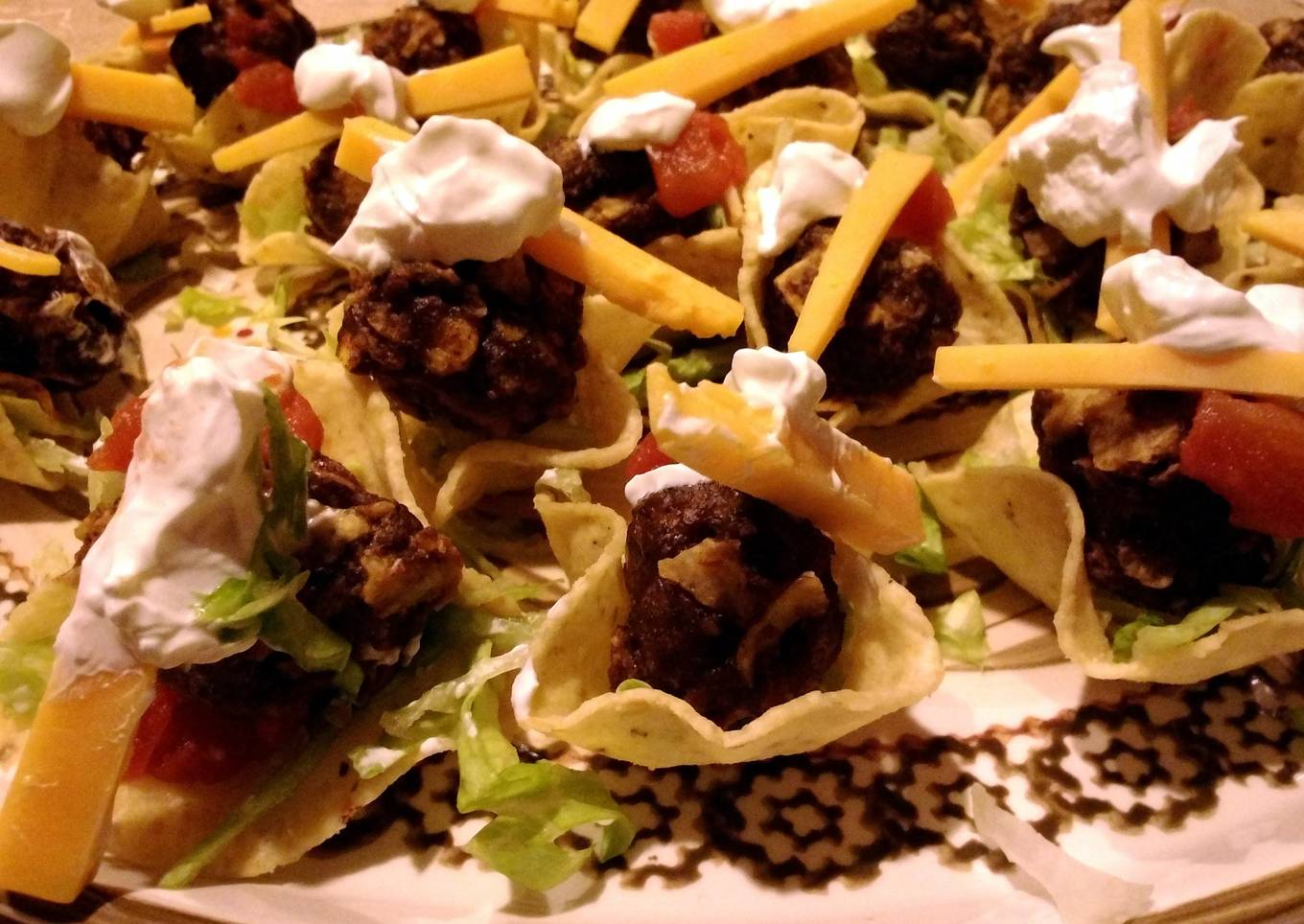 - On a platter take tortilla scoop chips, a tablespoon of shredded lettuce, top with meatball.
