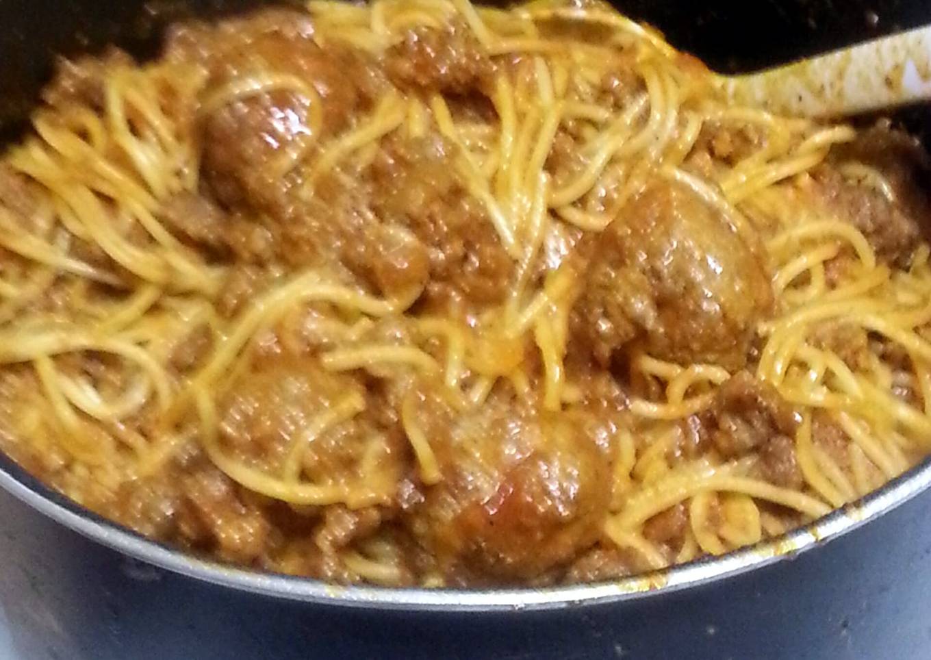 - Once pasta is aldente, drain run cold water to rince put back in pot add ground brown meat and meat ball stir as you stir add bbq sauce till pasta is completely covering noodles and balls the wetter the better.