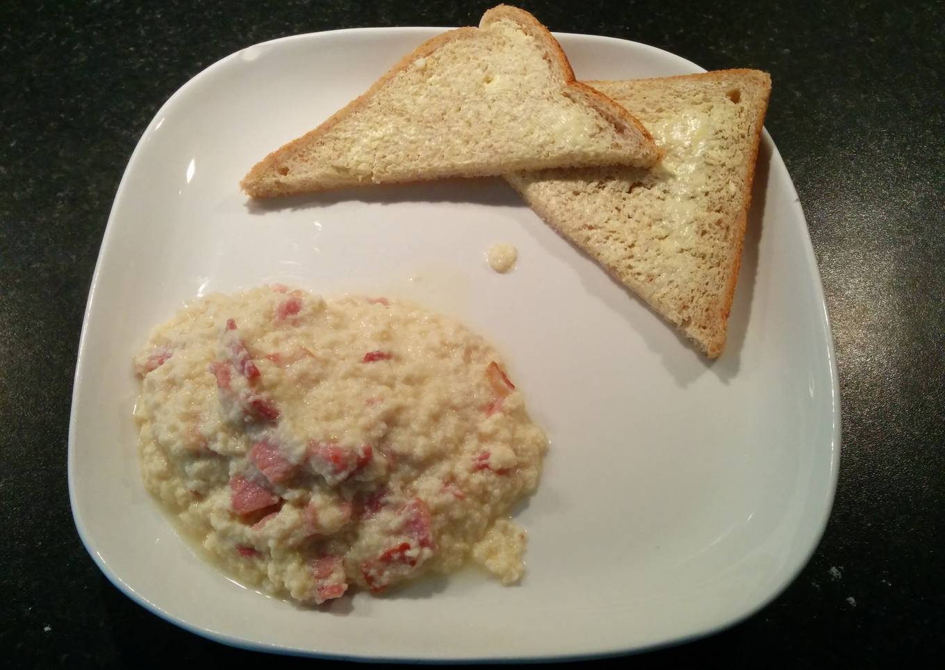- Put the eggs and flour into a bowl and beat together vigorously with a fork until there are no lumps left. Then beat in the milk and season.Pour this mixture over the well-browned lardons and cook, stirring constantly. The mixture will thicken and take the consistency of scrambled eggs or a runny omelette. Serve on slices of spelt bread.