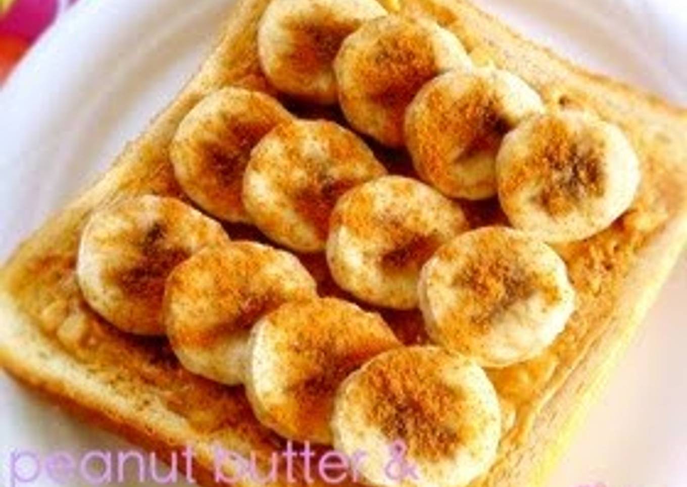 - Spread the peanut butter on the bread. Arrange the round slices of banana on top, and sprinkle with cinnamon powder. Toast in a toaster oven until golden brown, and it's done.