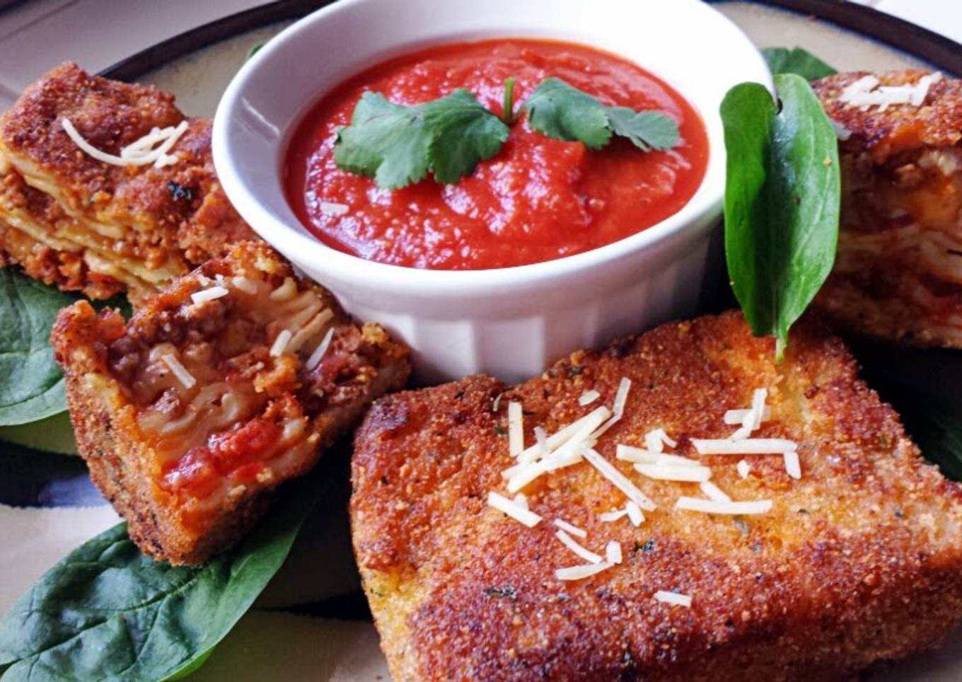 - Make a assembly line for your lasagna...flour/scramble eggs/bread crumbs add parmesan cheese & parsley. Now cut cold lasagna into squares dredge in Flour then egg mixture then breading fry on low heat till golden.serve with your favorite sauce top with fresh grated parmesan cheese