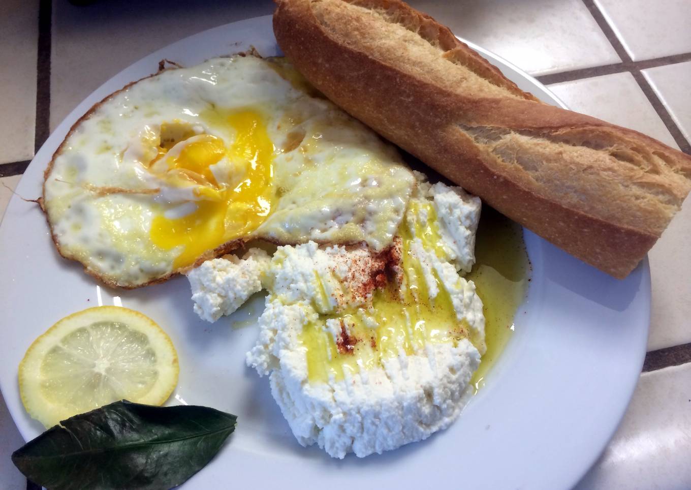 Assemble the plate with soft cheese and eggs. - Poor some olive oil, salt, and black pepper